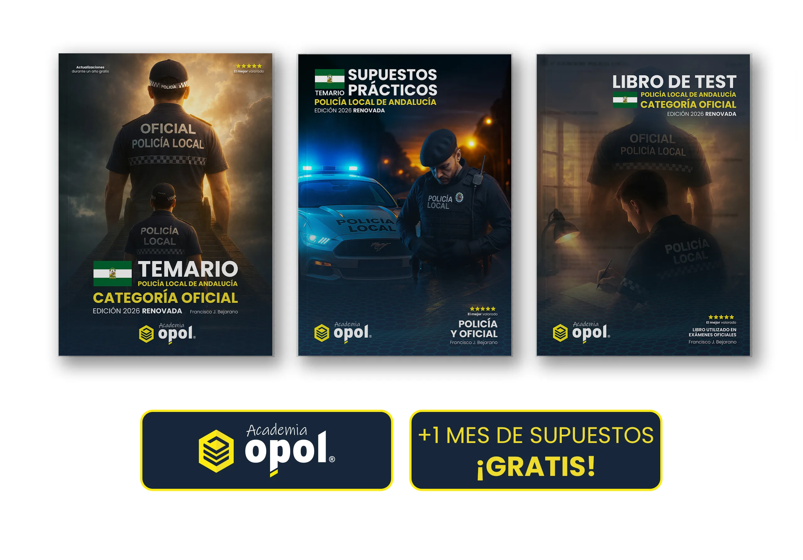 Packs que contiene el Temario de Teoría, Libro de Test y Temario de Supuestos para Oficial de Policía Local de Andalucía.
